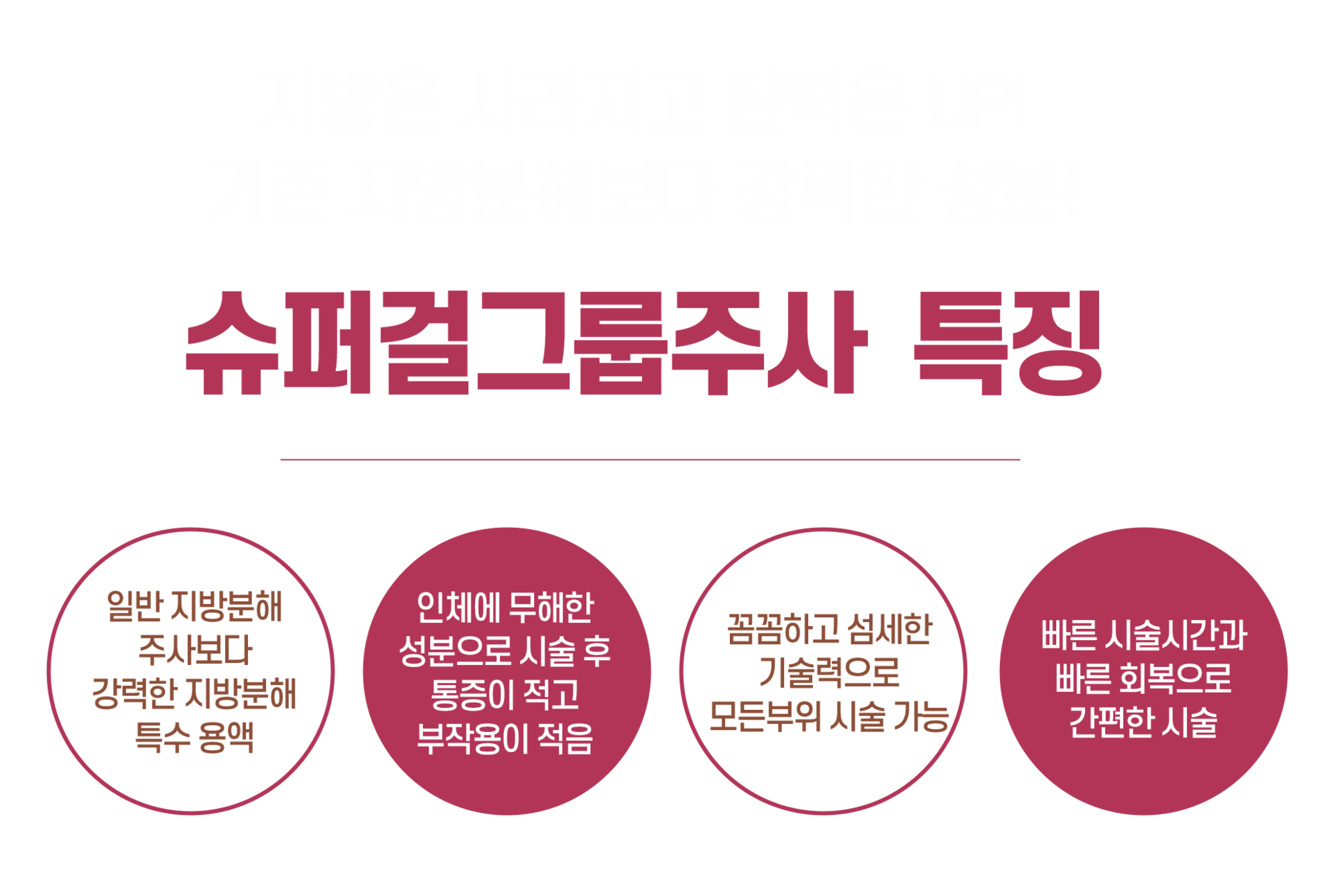 지방분해에 효과적인 강력한 성분의 용액이 체내에 들어가면서 피하지방 층에서 삼투압 현상이 일어나 지방세포가 부풀어 오르고 약물과 레이저를 병행하여 림프순환 개선이 이루어 집니다.